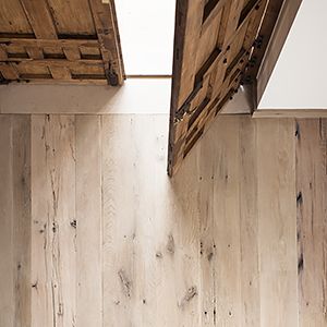Pre-finished by hand, this Oak has a pure and natural look and feel. We bleach it with our own custom lye, which gives the patina long-lasting protection against yellowing. This finish works well on both uniform and more rustic Oak patterns for floor and wall cladding.