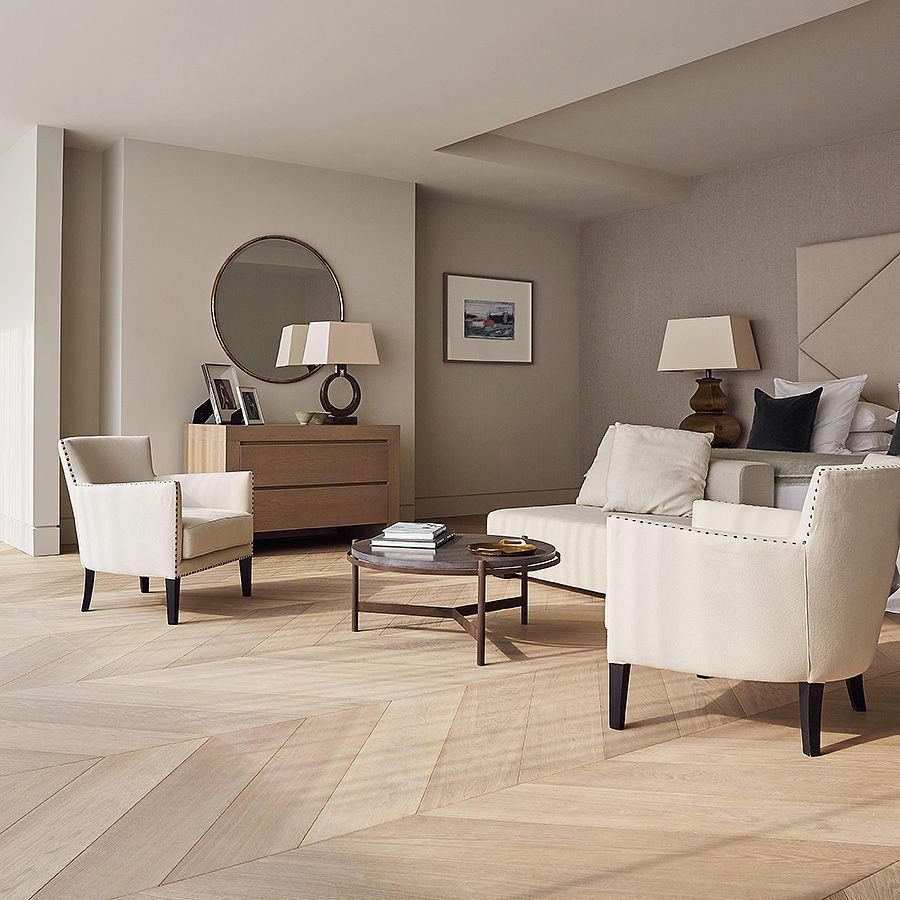 Pre-finishing by hand gives the Oak a pure blended beige-grey patina. Before we apply a hard-wearing lacquer, the Oak is bleached and oiled to ensure that the soft grey patina has long-lasting protection from yellowing. This finish works well on more uniform wide planks and parquet patterns for floors and walls.