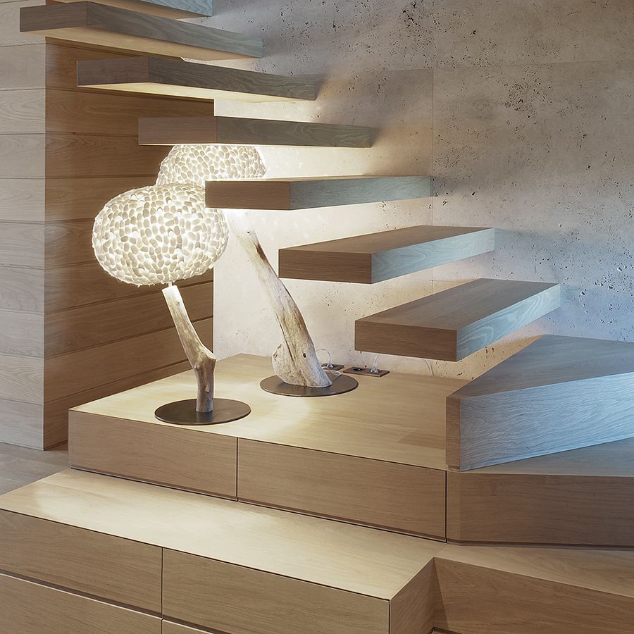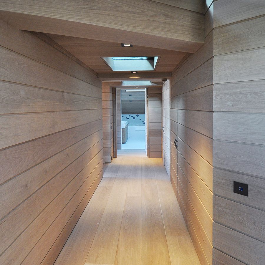 In this Chalet project, designer Martine Tomé used our purest selection of American White Oak, in long and wide boards for all wide plank floors and wide plank ceilings. For wooden walls and wooden stairs, we custom-crafted the same selection of solid American White Oak. All surfaces were finished with our Ultramatt Poly finish to keep the wood as matt and as natural as possible.