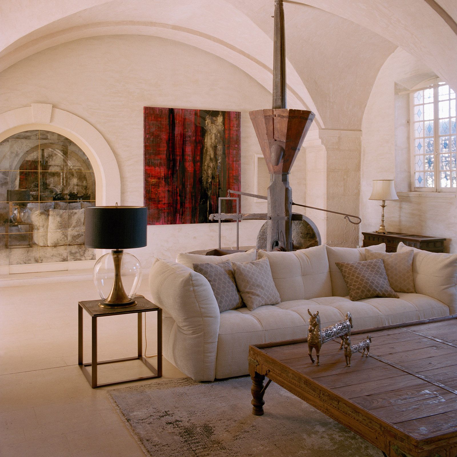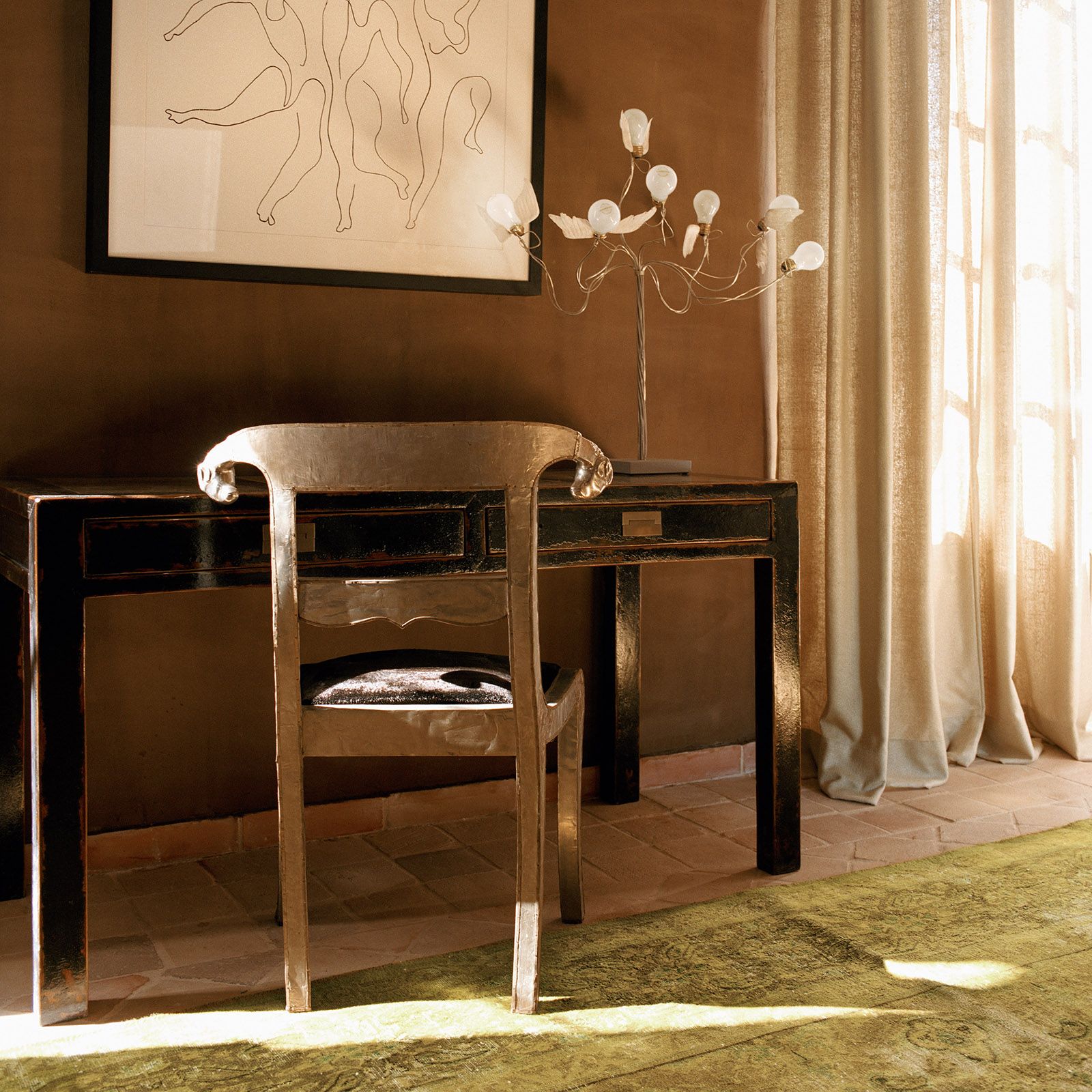 Materials were deliberately picked for their storytelling power, adding layers of history to the high-ceilinged spaces. Marble, terracotta tiles, exposed beams and Ebony and Co’s Continental Oak Megève Lava Hardwax wide plank flooring all add character to the different interiors. Fabrics chosen for the upholstery hint at the relationship of this part of France with India.