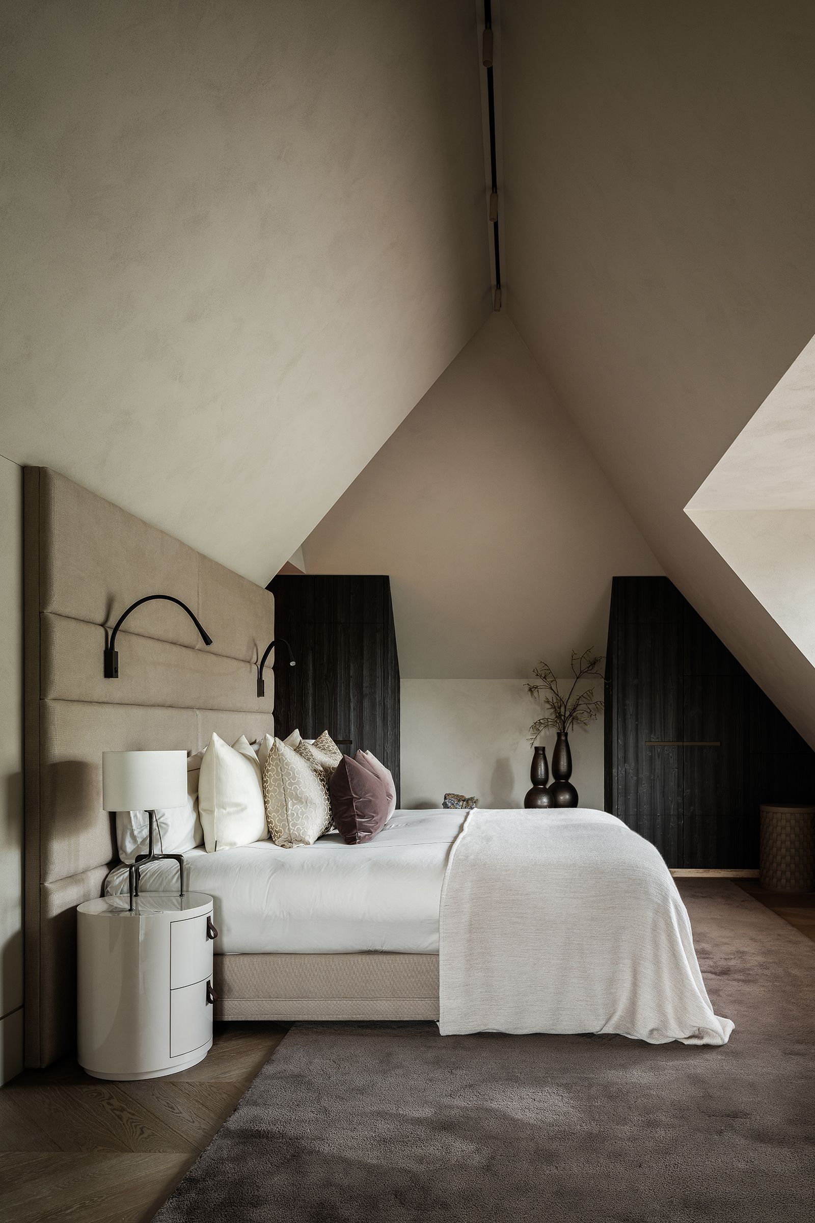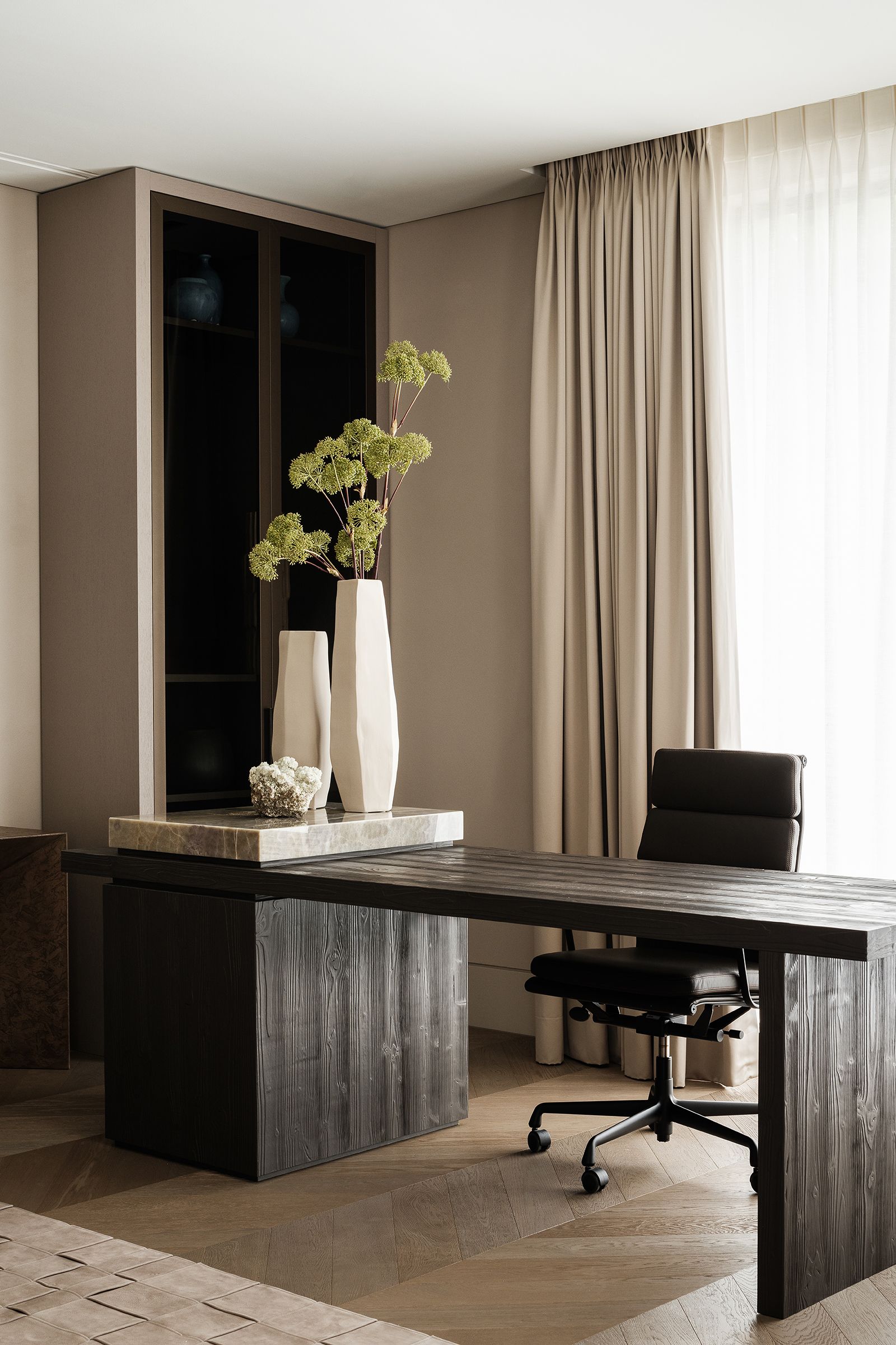 The chevron flooring adds a refined touch, complementing the modern minimalist design.
