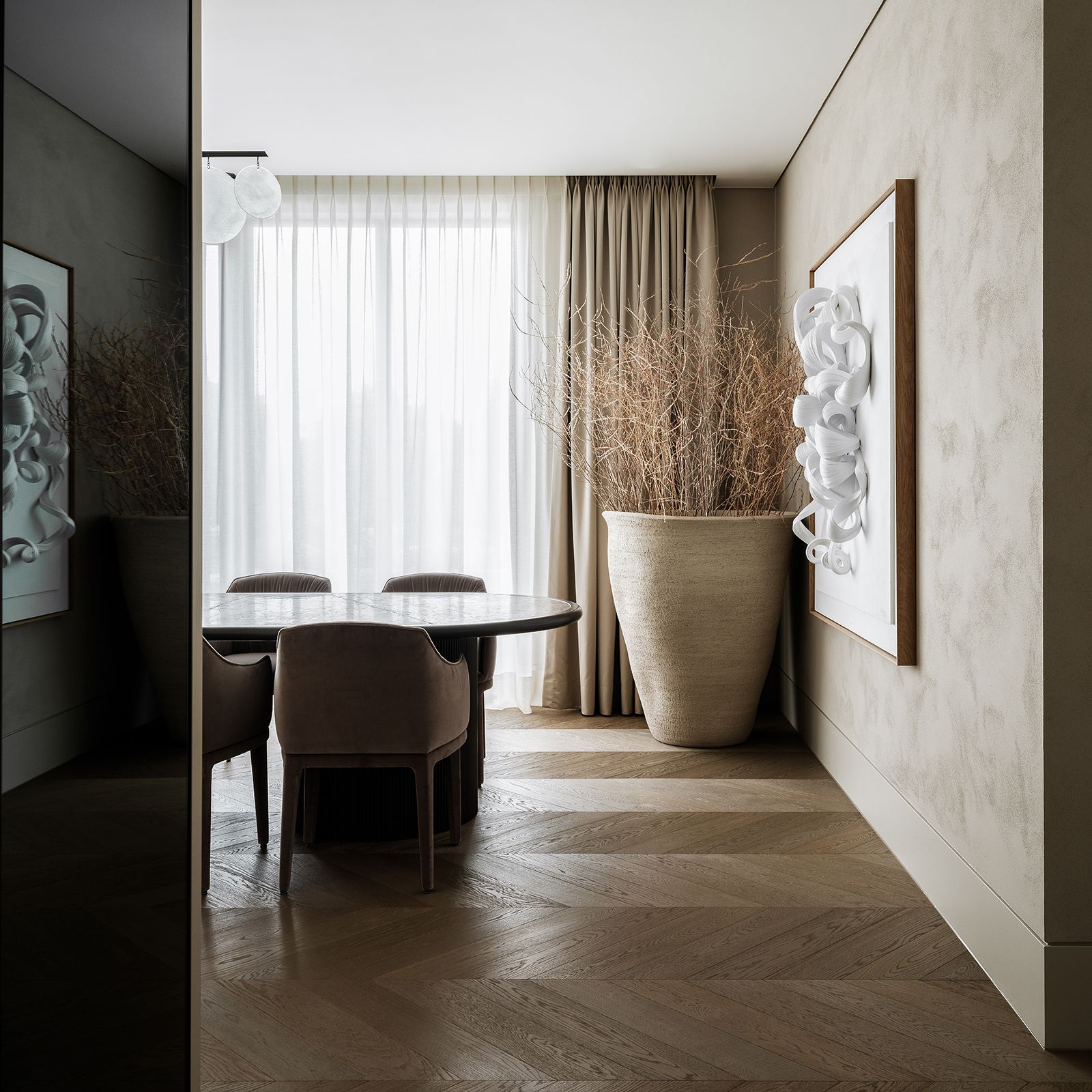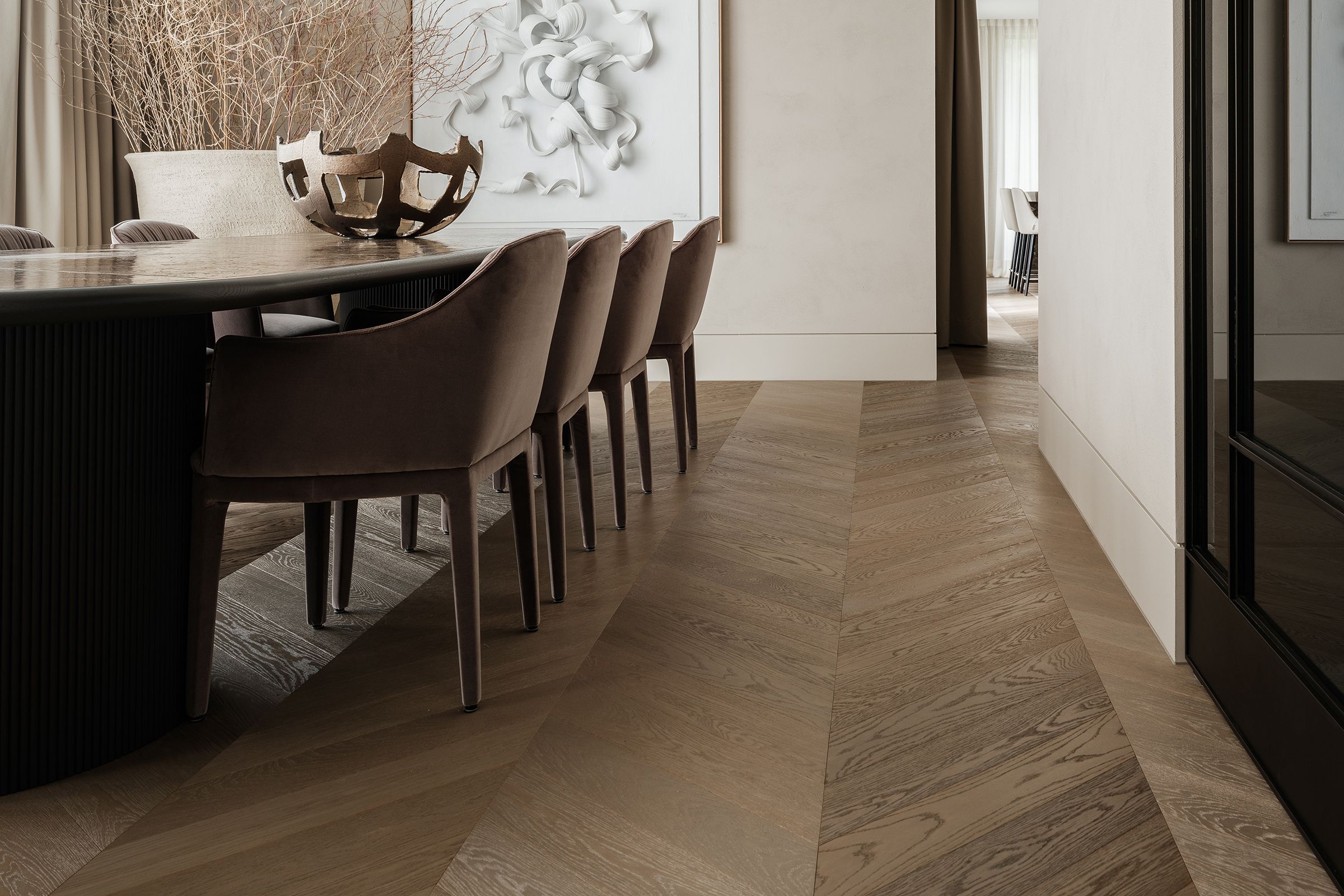 The dining area exudes refined elegance with the same chevron flooring. The neutral tones of the Oak floor blend with the muted color palette of the furnishings and decor, creating a serene and inviting environment for dining and entertaining.