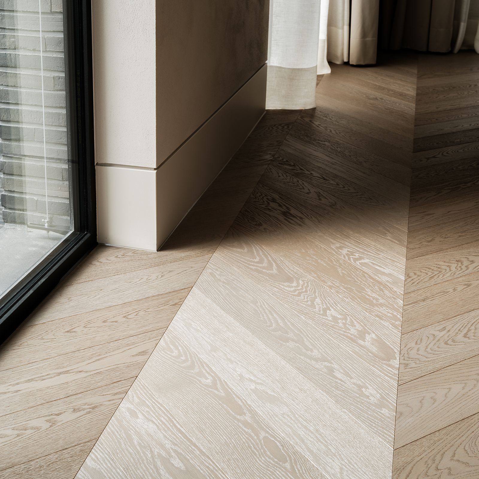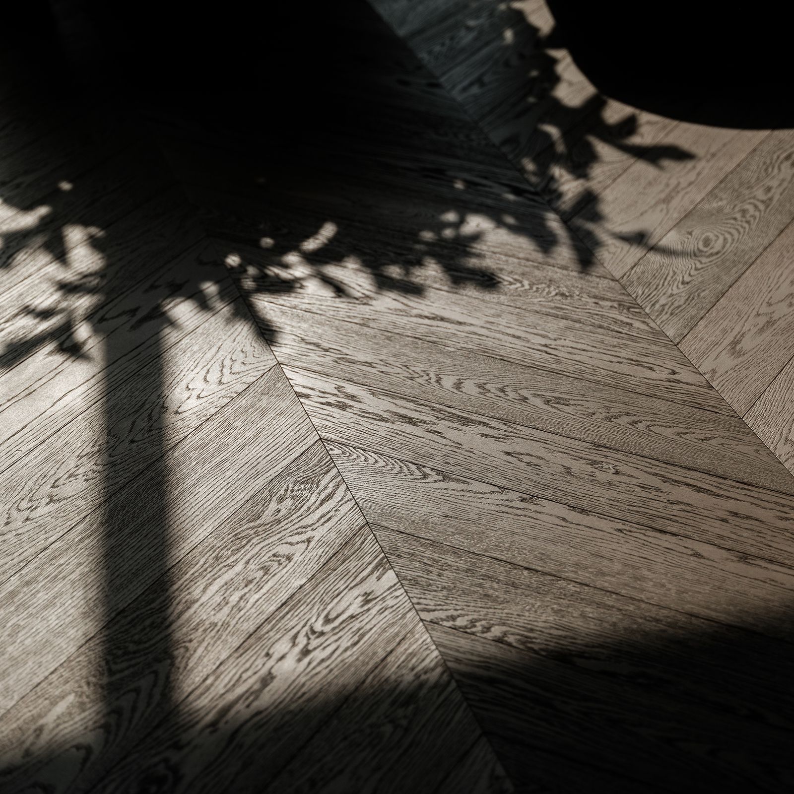 Close-up details of the flooring reveal the chevron pattern and rich texture of the Brushed Nickel Grey Hardwax finish. The play of light and shadow on the engineered Oak planks highlights the meticulous craftsmanship and attention to detail.