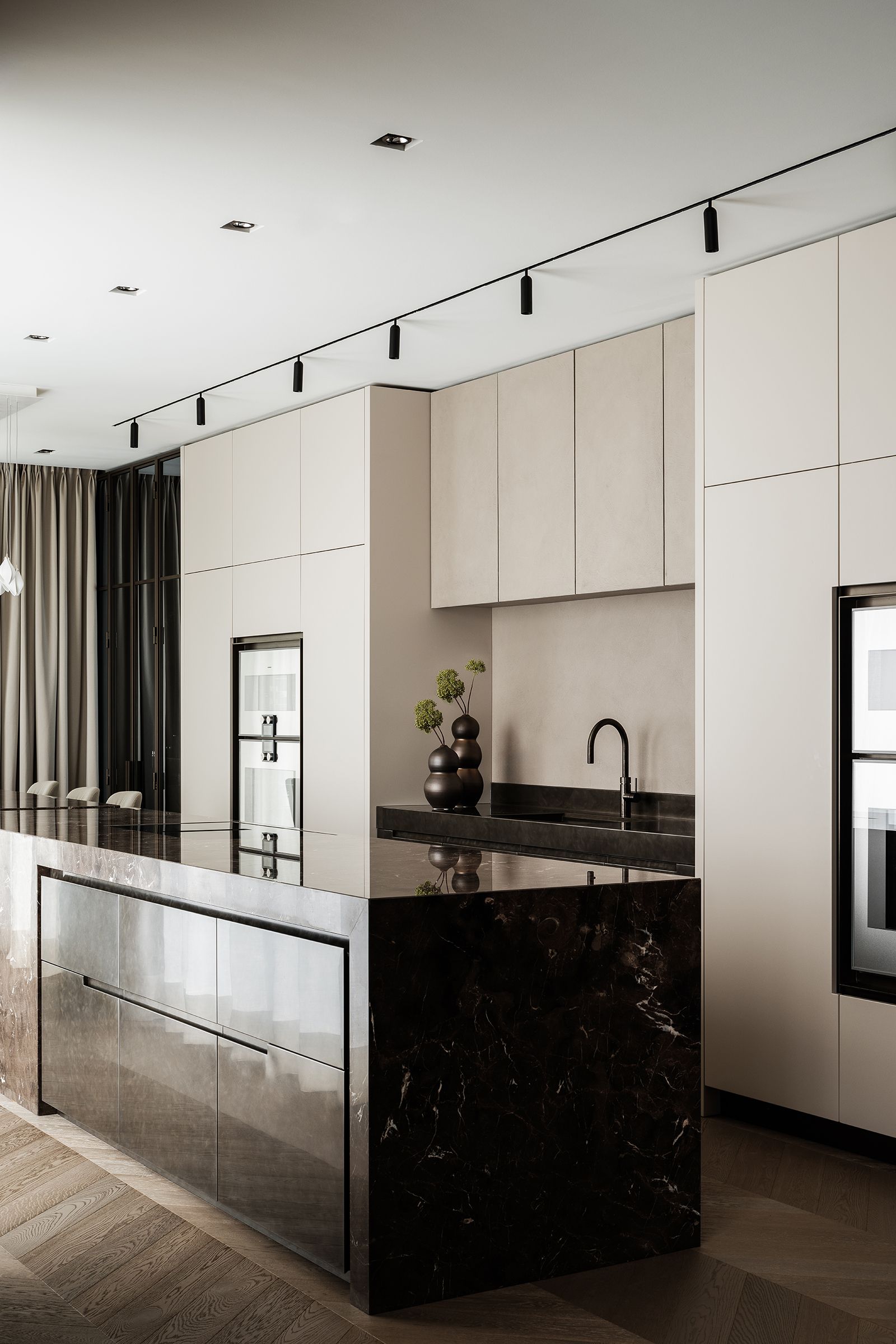 In the kitchen, the flooring contrasts elegantly with the dark marble island and light cabinetry. The chosen materials and finishes create a sophisticated yet inviting atmosphere.