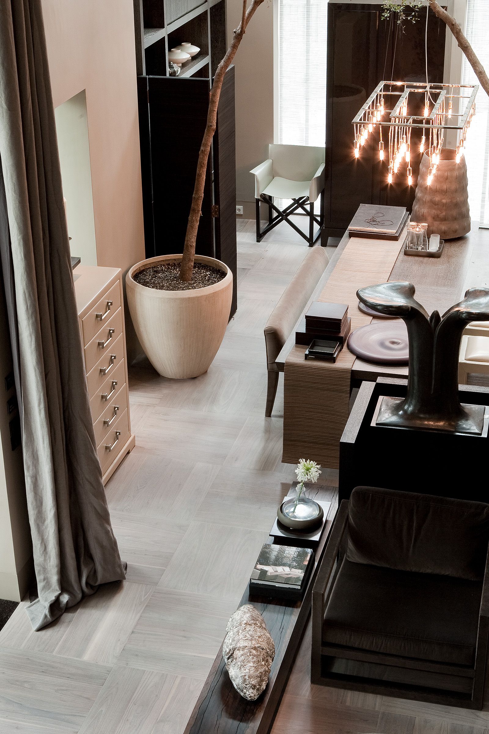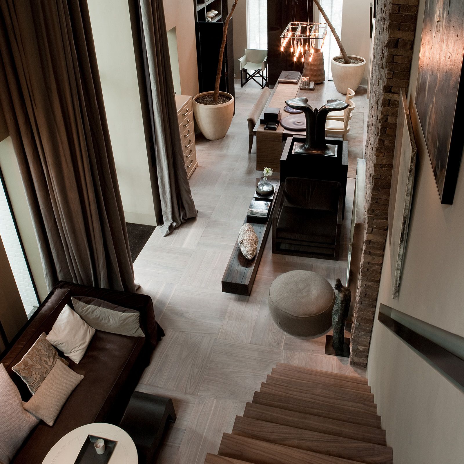 Marcel Wolterinck's Orangerie in Laren, The Netherlands, masterfully blends natural materials with refined design. The American Walnut flooring, laid in large basket weave squares, provides a striking yet understated foundation, while the faded Ultramatt Poly finish enhances the wood's natural beauty.