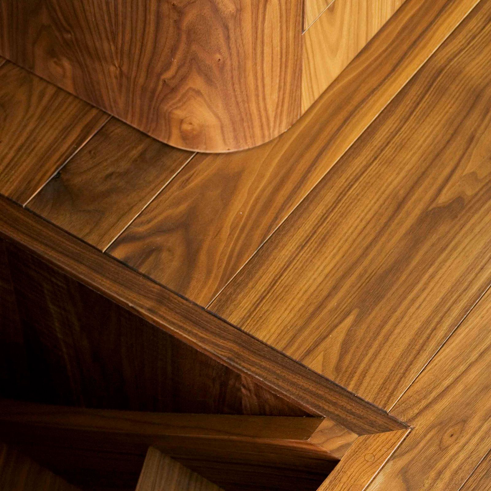 The smooth transitions between the floor and curved walnut walls demonstrate exceptional craftsmanship, enveloping the space in continuity and warmth.