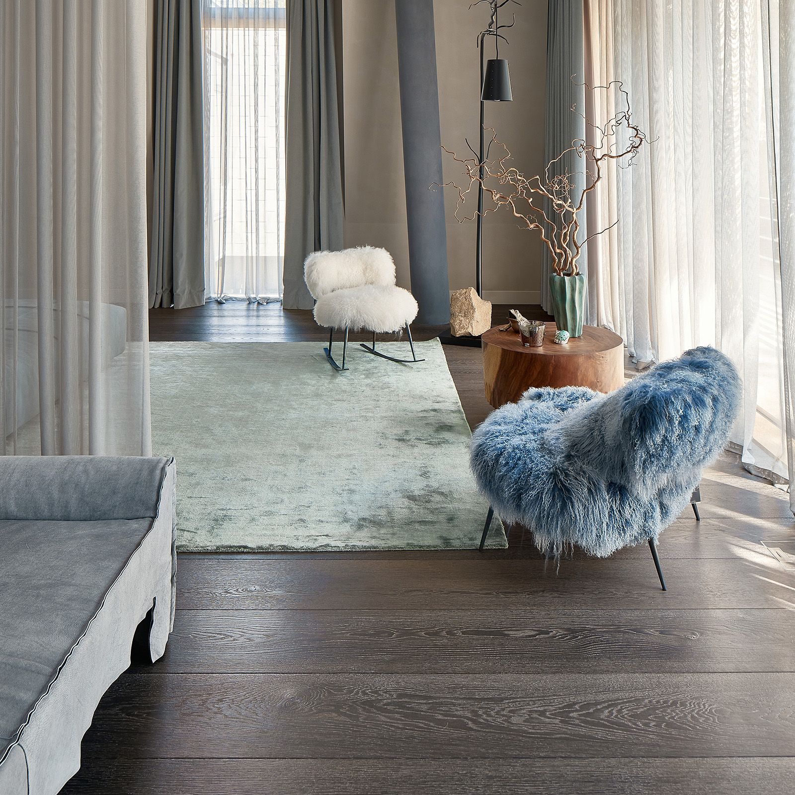 In the living spaces, the soft tone of the Megeve Lava finish adds depth while allowing furniture and textures to stand out gently against the floor.