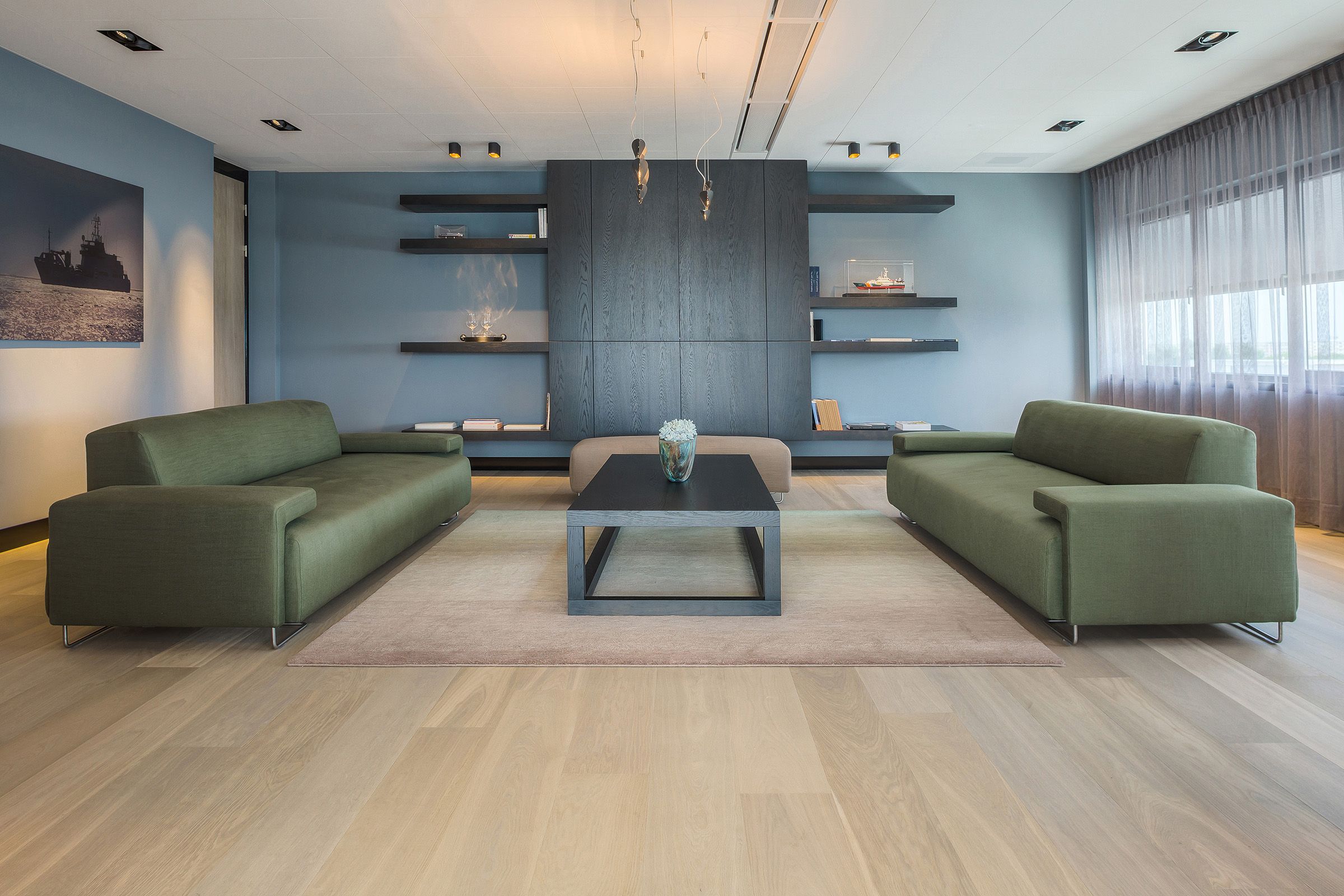 The main office area highlights the natural beauty of Continental Oak Select Grade flooring, finished in Faded Silvergrey Ultramatt Poly. The 25 cm fixed width enhances the uniformity and sleek design, perfectly complementing the minimalist, modern furniture.