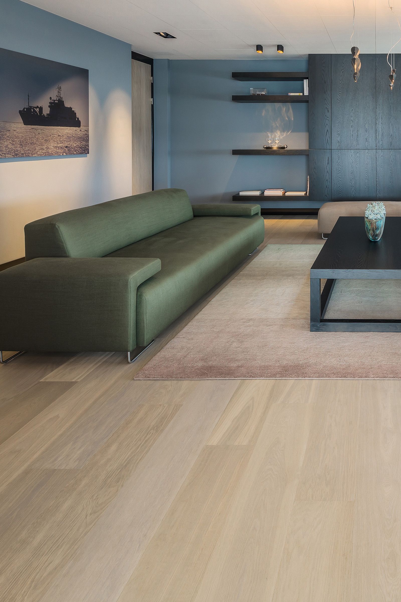 Floor:Continental Oak Select Grade, finished with Faded Silvergrey Ultramatt Poly, in a fixed width of 25 cm.