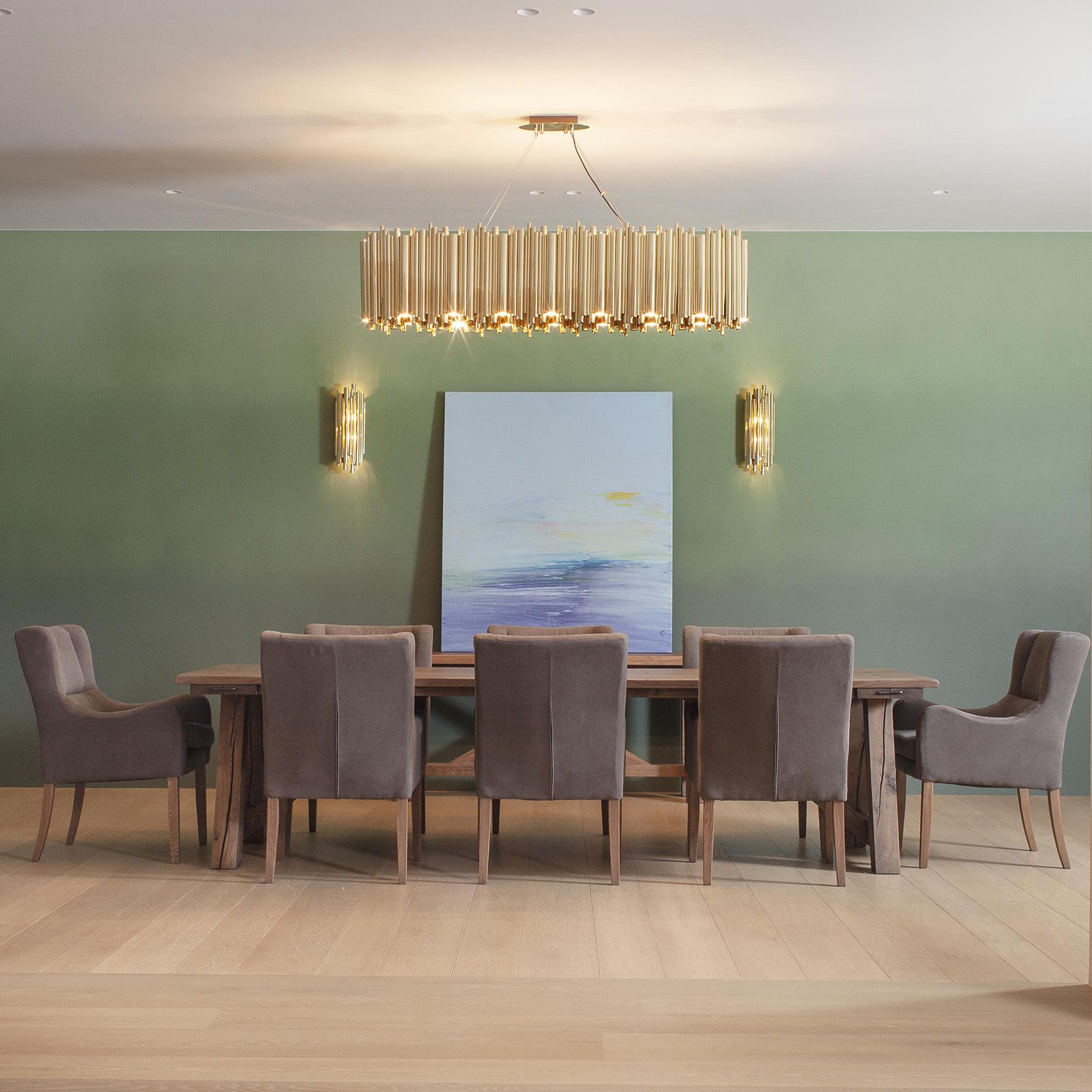 In other areas, the same Oak flooring is finished with a pure Ultramatt Poly, offering a sleek, seamless appearance that adds a modern touch. The variation in finishes adds depth and dimension, contributing to a sophisticated yet welcoming environment.