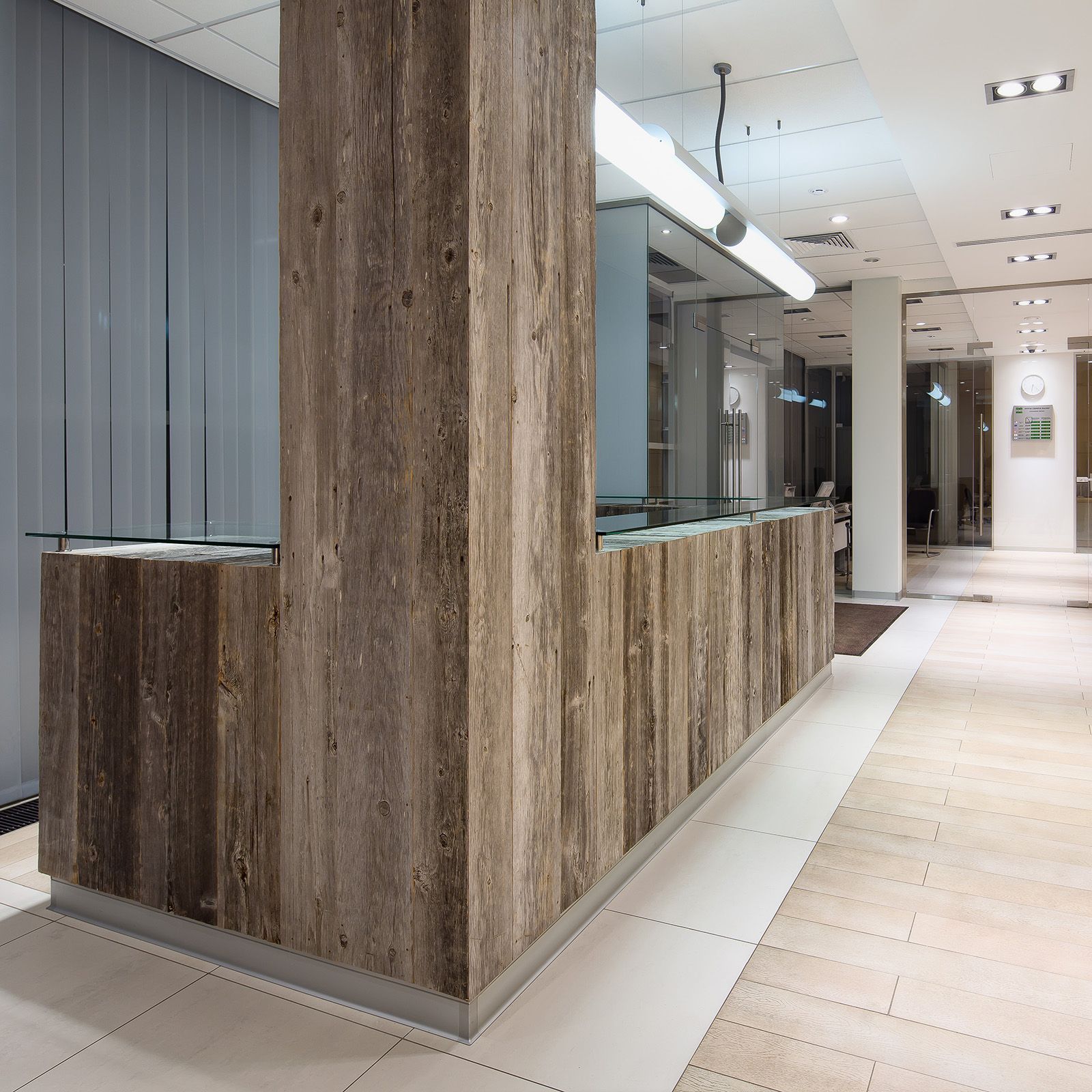 In contrast, the bar area features Antique Canadian Barnwood paneling with a Weathered Silvergrey finish, adding rustic texture to the sleek office. This juxtaposition adds character and reflects the bank's heritage while embracing a modern aesthetic.
