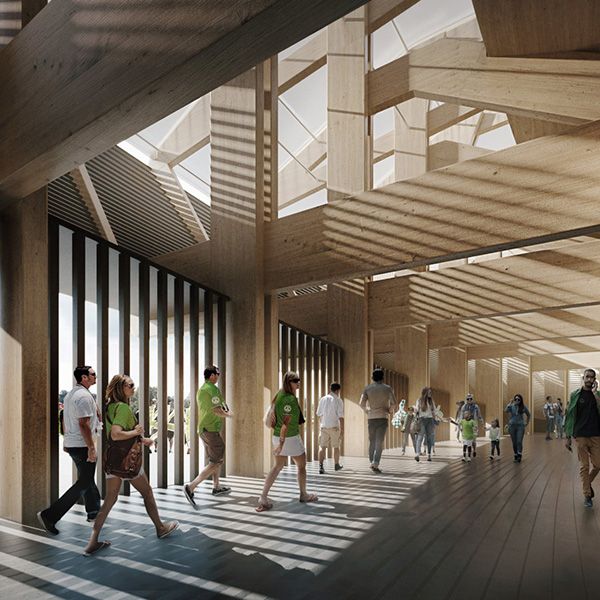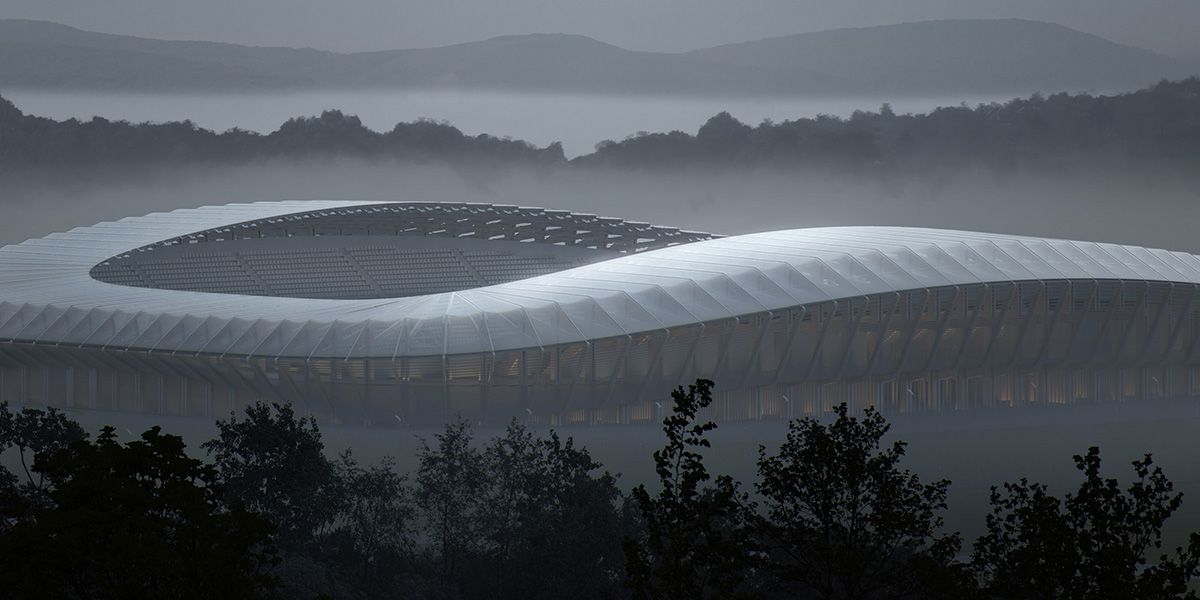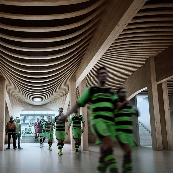 The design of Zaha Hadid Architects retains and enhances the existing meadow landscape of the site whilst adding the stadium and other functions for the town. Embodying low carbon construction methods and operational processes, it will be the first all-timber football stadium, with almost every element made of sustainably sources timber including its structure, roof cantilevers and louvred cladding.Sustainability of wood architecture