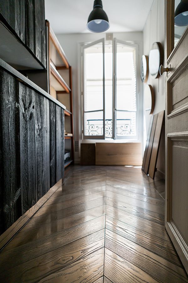 As usual, all eyes are (first) on the flooring. Here in Paris, it resulted in a daring yet elegant combination of two similar hardwood parquet patterns where we contrasted the original oak floor with a contemporary looking hardwood floor. What both have in common is the chevron pattern, also known as Point de Hongrie, after a kind of embroidery stich that came into style during the 16th century.