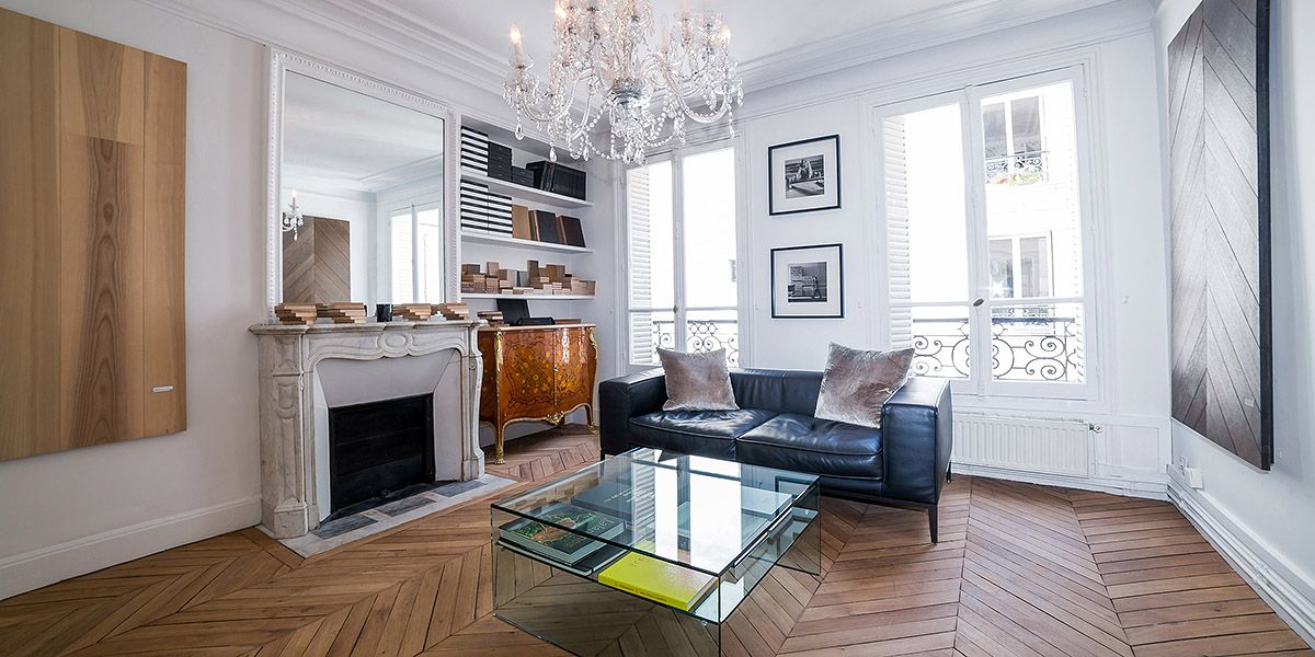 Yes, we restored the original chevron oak floor, which was originally installed in the apartment over 200 years ago. It now makes a beautiful marriage with our contemporary chevron metallic Ash floor, coated with Nickel-Silver. The furniture in blackened barnwood is the cherry on the cake. Contrast in harmony! I also love the interior’s colour locale with its white marble fireplaces and typical Parisian crown moldings on the ceilings.